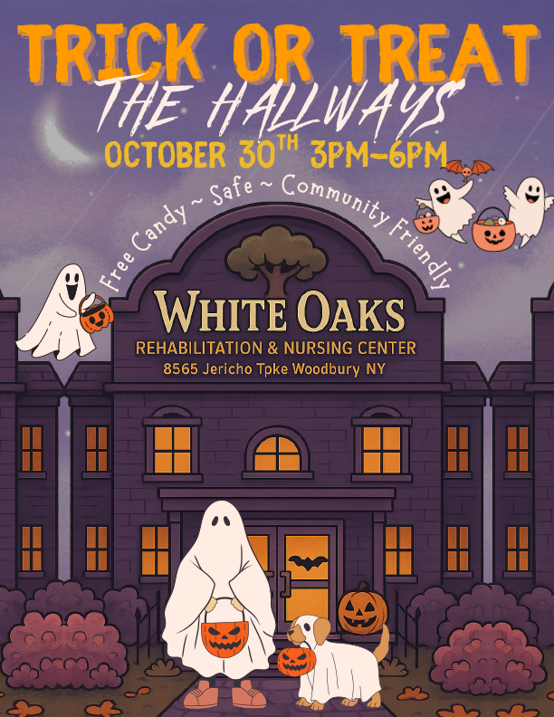 Trick or Treat the Hallways ! On Thursday, October 30th, from 3–5 PM, children, teens, and young adults (accompanied by a chaperone) are invited to Trick-or-Treat and parade through our festively decorated halls in costume! Our residents and staff will be handing out candy, and light snacks will be available. It’s a spooktacular way to spread joy and celebrate Halloween safely together. Please RSVP so we can prepare enough treats for all our little ghouls and goblins! 516-367-3400 or info@whiteoaksrehab.com