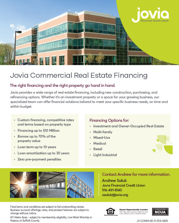 Jovia Offers Commercial Real Estate Financing Back to News Items Jovia Offers Commercial Real Estate Financing By Felice Linder 10/24/2025 Images × Share × Email Facebook LinkedIn X Pinterest Powered By GrowthZone
